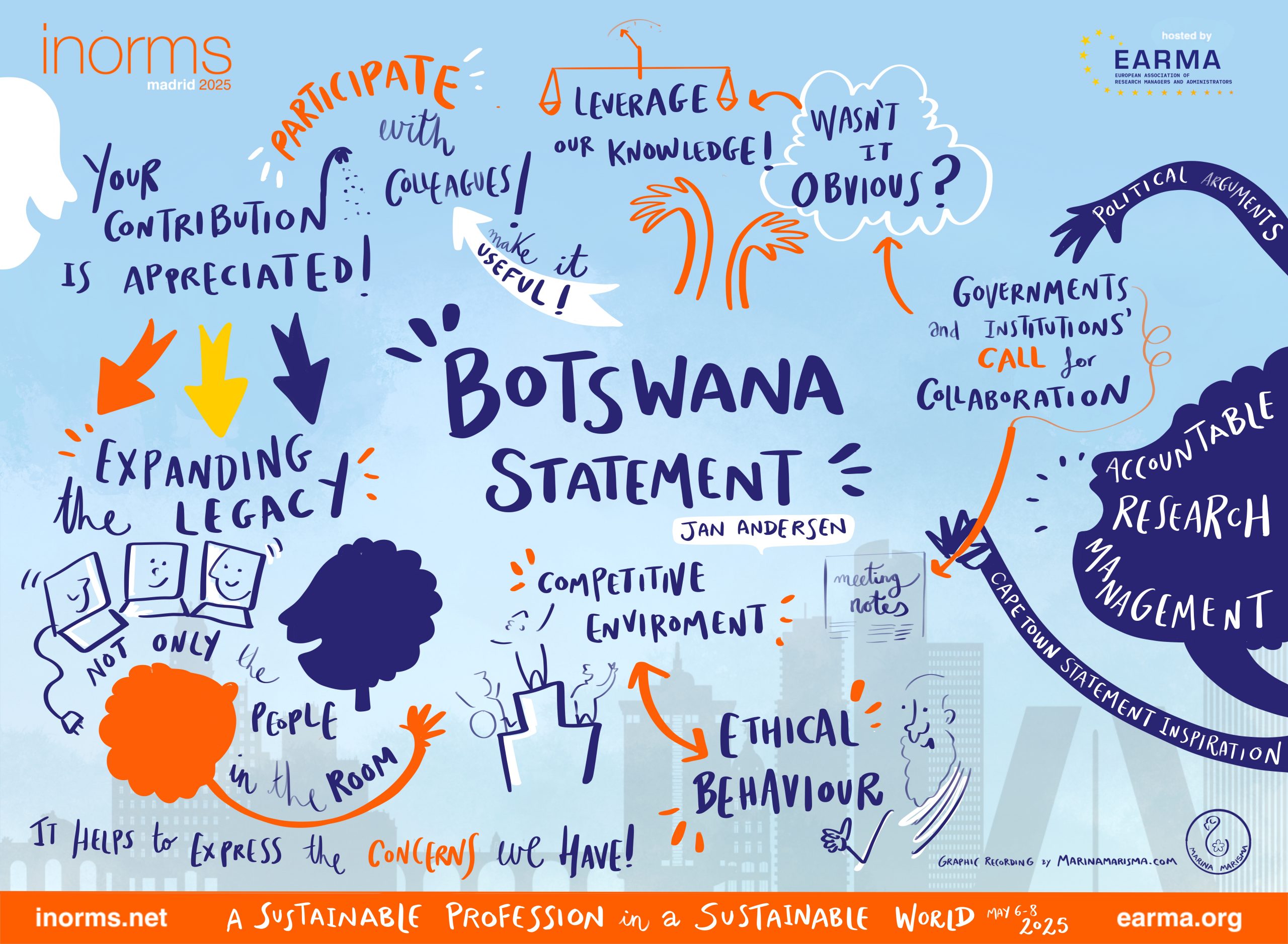 The International Network of Research Management Societies (INORMS) enables interactions, sharing of good practice, and joint activities between the member societies worldwide, irrespective of their national political situation, to the benefit of their individual memberships. We all face similar challenges and aspire to a common goal: to improve our local, national, and global research landscapes, and enable excellent research and its impact. For this, we need to ensure that the profession of Research Management and Administration is sustainable and contributes to a sustainable world. Actions and ambitions are described within the two pillars of this Statement, building on the work of the 2024 INORMS Botswana Statement, and the principles in the 2021 INORMS Hiroshima Statement.